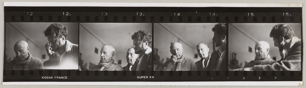 Planche contact de Pablo Picasso avec Shalom Reiser et un ami dans l'atelier du Fournas, Vallauris, le 17 avril 1951