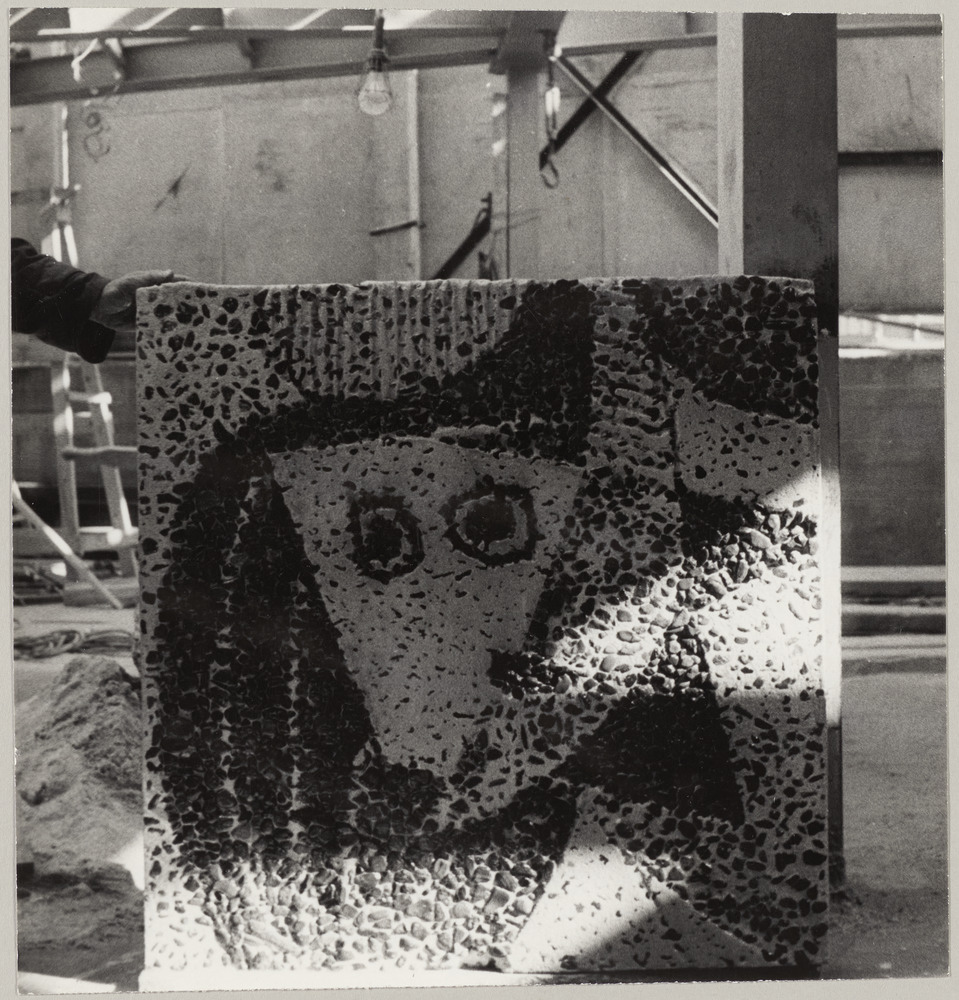 Plaque en bétogravure réalisée par Carl Nesjar et d'après un dessin de Pablo Picasso, sur le chantier du Collège des architectes de Catalogne, Barcelone, le 9 février 1960