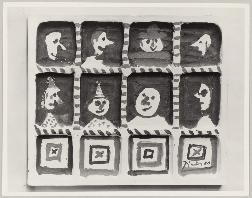Plaque en céramique décorée de 8 têtes et formes géométriques, Madoura, 9 mars…