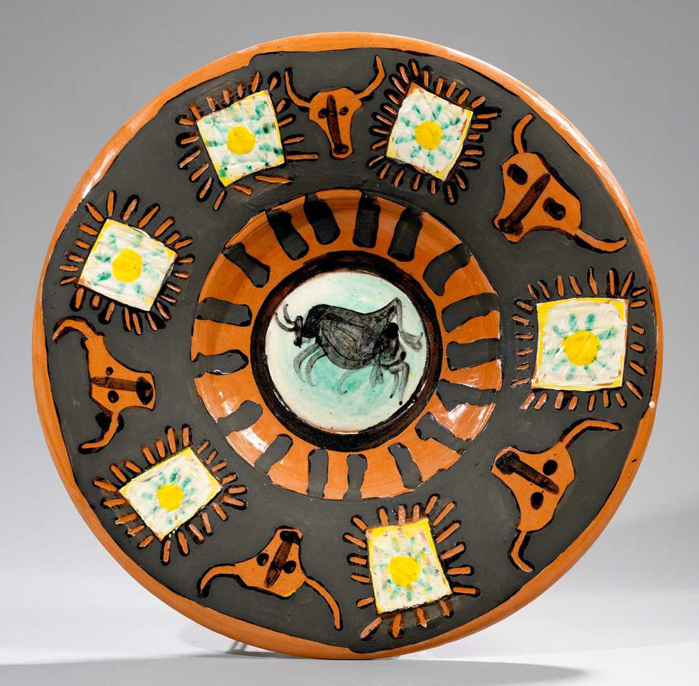 Copié dans le presse-papier :Plat espagnol décoré de taureaux et de motifs solaires à l'intérieur et d'un… - Pablo Picasso - 14 mai 1957 - https://cep.museepicassoparis.fr/explorer/plat-espagnol-decore-de-taureaux-et-de-motifs-solaires-linterieur-et-dun-mp1990-373