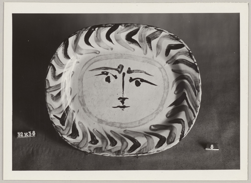 Plat rectangulaire en céramique décoré d'un visage, dans l'atelier Madoura, Vallauris, en 1948