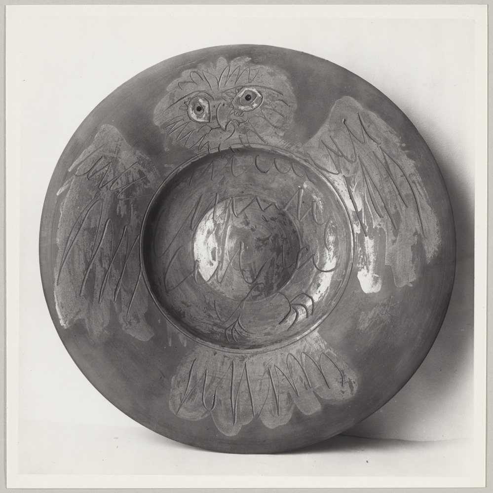 Plat rond en céramique "Hibou rouge sur fond noir", Madoura, 10 mai 1957