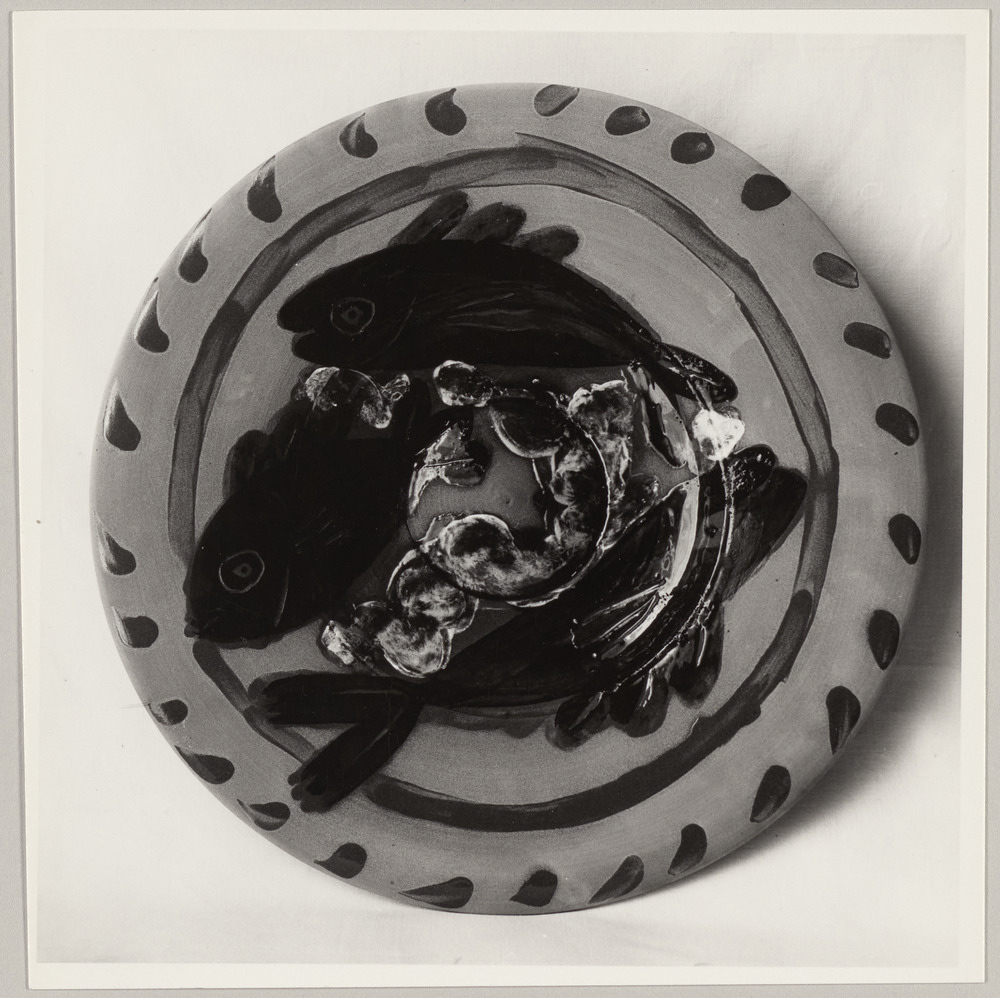 Plat rond en céramique "Trois poissons noirs", Madoura, 15 avril 1957