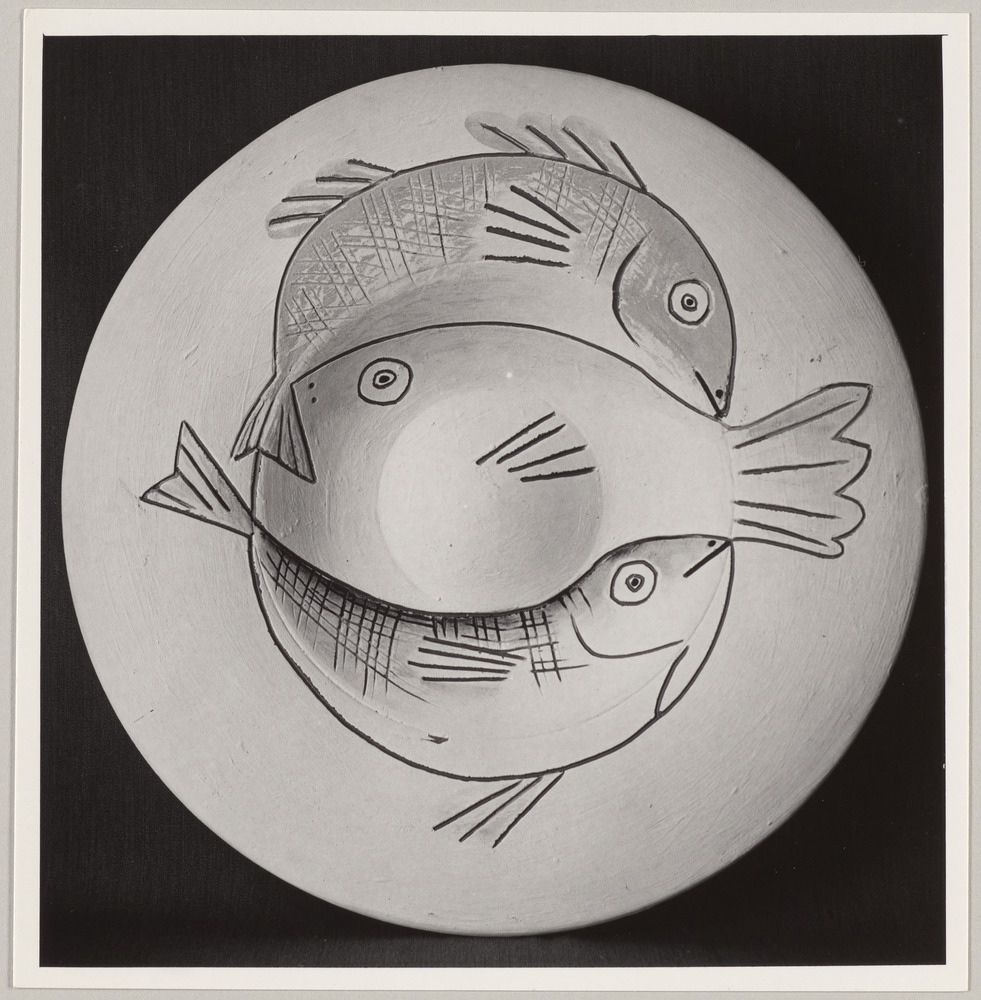 Plat rond en céramique "Trois poissons sur fond blanc", Madoura, 13 avril 1957