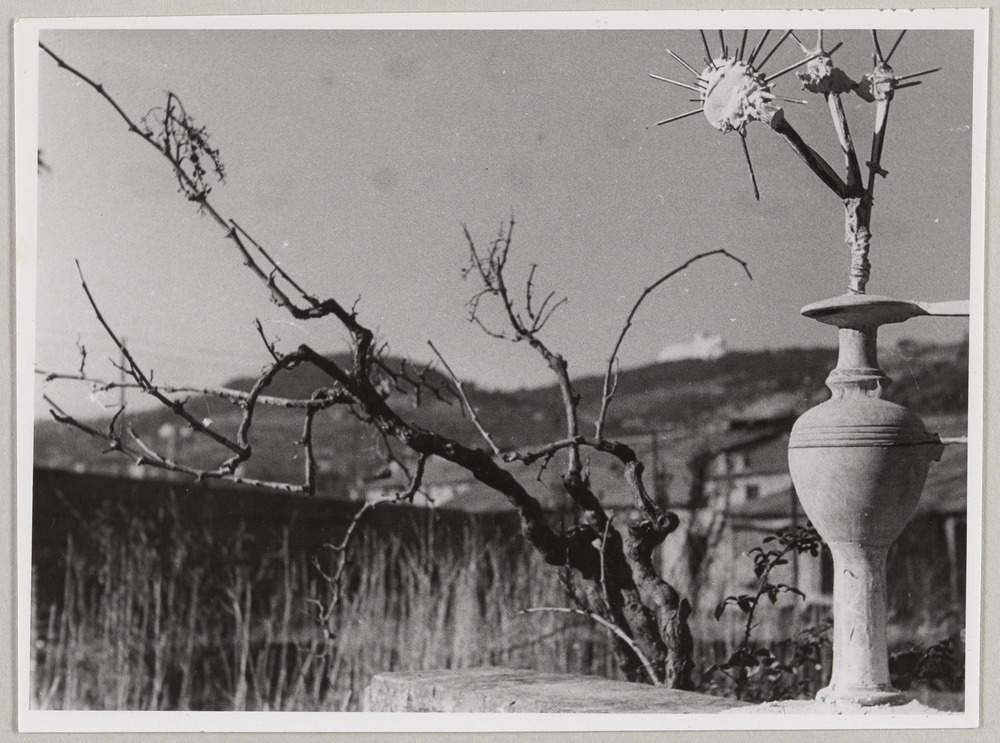 Plâtre "Nature morte au bouquet de fleurs" posé sur un muret de la cour de l'atelier du Fournas, Vallauris, en [1951]