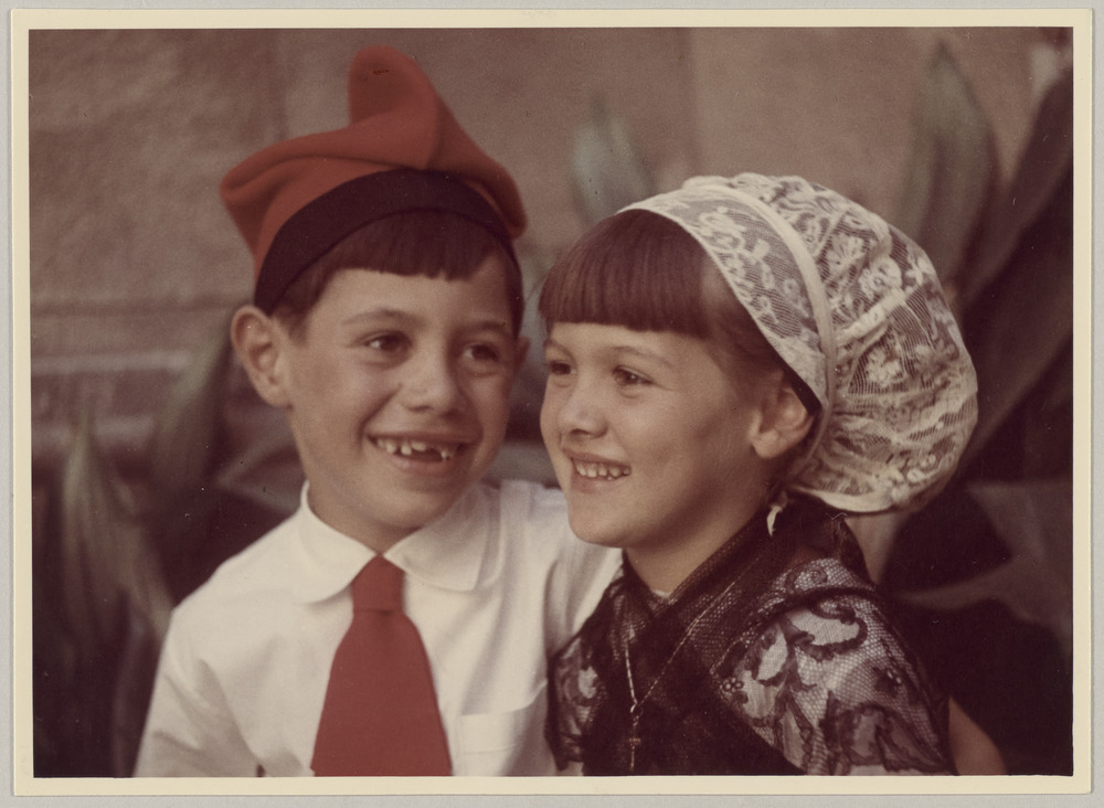 Portrait de Claude et Paloma Picasso en costumes catalans, dans la cour de l'hôtel particulier des Lazerme, rue de l'Ange, Perpignan, en août 1954