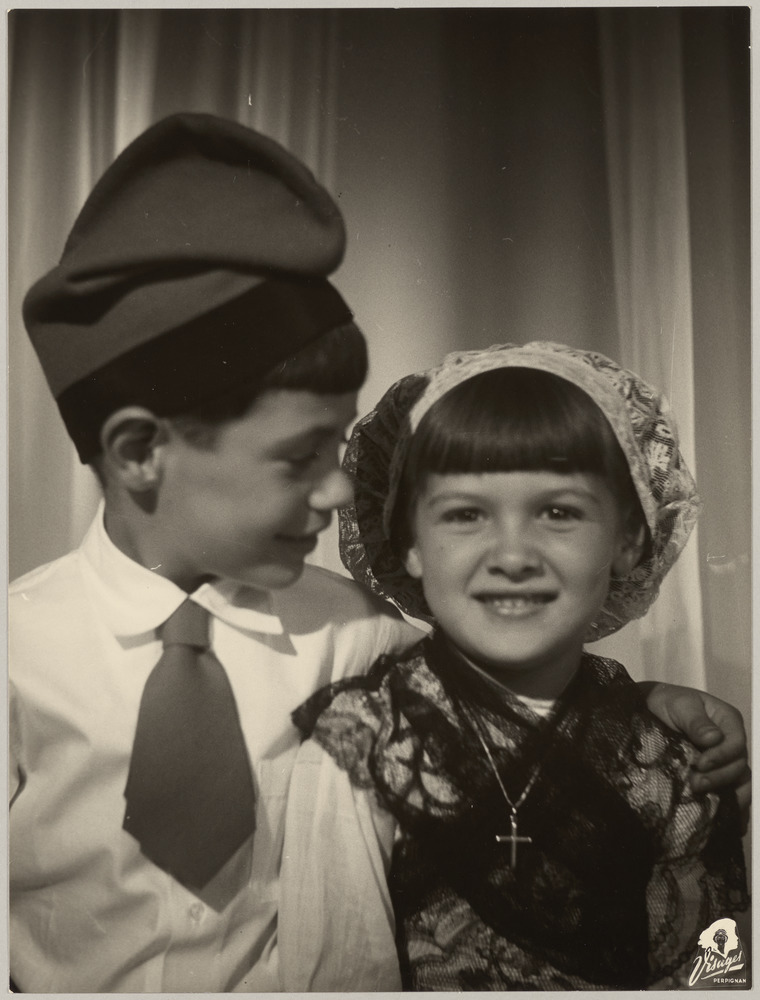 Portrait de Claude et Paloma Picasso en costumes catalans, dans le studio de Studio Visages, rue de l'Ange, Perpignan, en août 1954