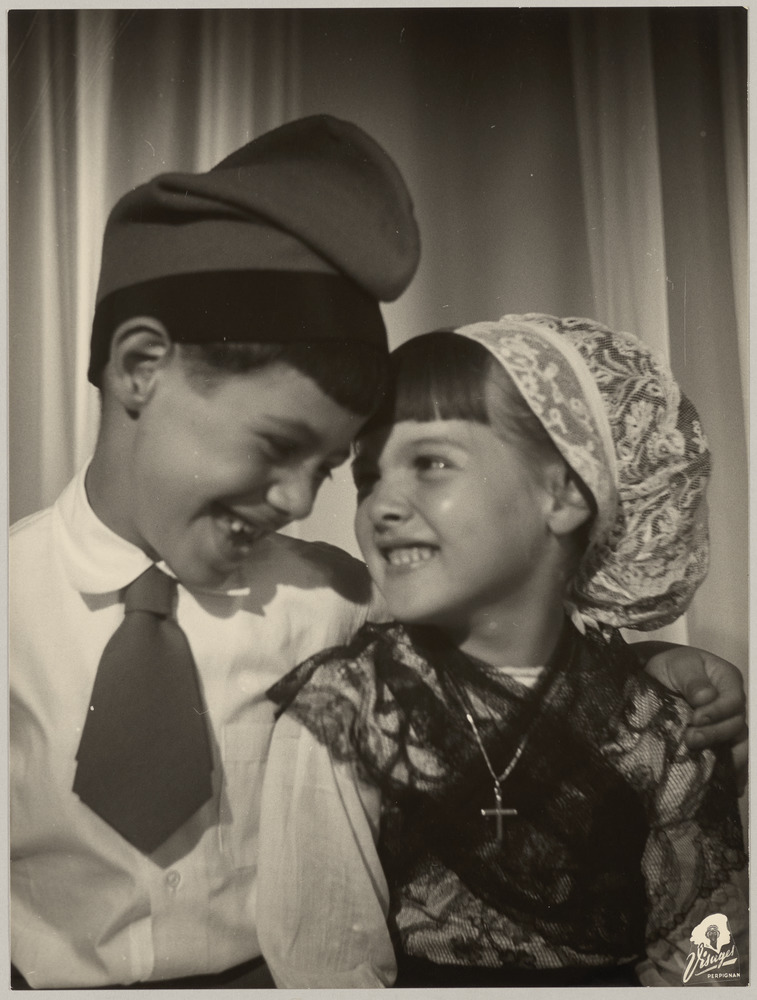 Portrait de Claude et Paloma Picasso en costumes catalans, dans le studio de Studio Visages, rue de l'Ange, Perpignan, en août 1954