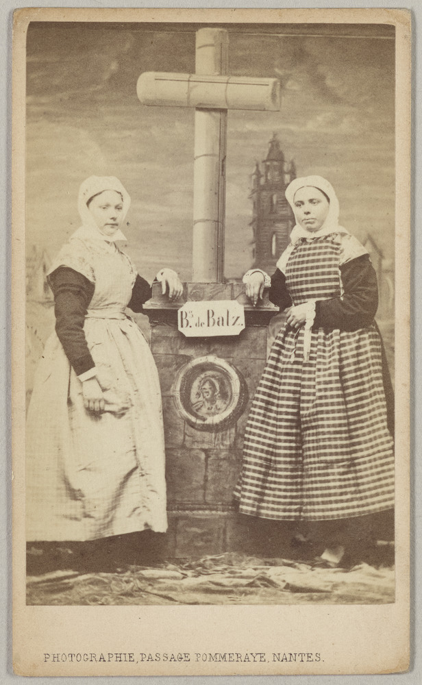 Portrait de deux femmes, en pied, dans un décor évoquant le Bourg de Batz