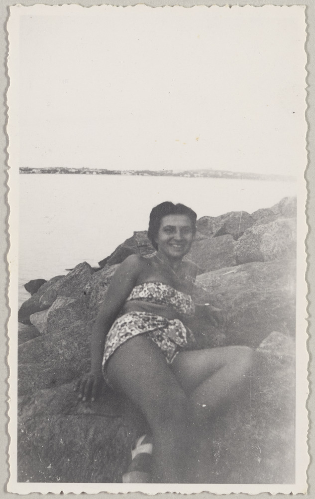 Portrait de femme en maillot de bain dans les rochers, proche de la plage, le 13 septembre 1947