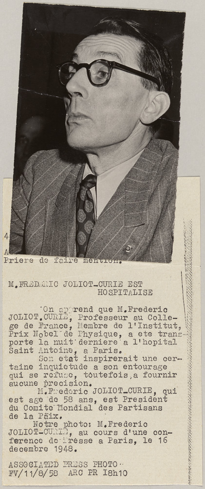Annotation dactylographiée au dos sur un feuillet collé au dos du tirage : "Prière de faire mention. M. Frédéric Joliot-Curie est hospitalisé. On apprend que M. frédéric Joliot Curie, professeur eu Collège de France, Membre de l'Institut, Prix nobel de Physique, a été transporté la nuit dernière à l'hôpital Saint-Antoine, à Paris. Son état inspirerait une certaine inquiétude à son entourage qui se refuse, toutefois à fournir aucune précision. M. frédéric Joliot-Curie qui est âgé de 58 ans est Président du Comité Mondial des Partisans de la Paix. Notre photo : M Frédéric Joliot Curie, au cours d'une conférence de presse à Paris, le 16 décembre 1948. Associated Press Photo. FV/11/8/58 ARC PR 18h10.