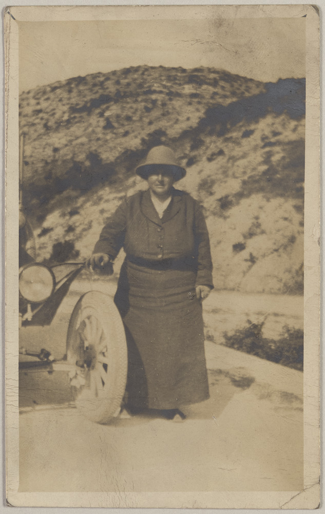 Portrait de Gertrude Stein à côté de "Auntie", sa Ford, en mission pour le Fond Américain pour les blessés français, [vers Perpignan], au printemps 1917