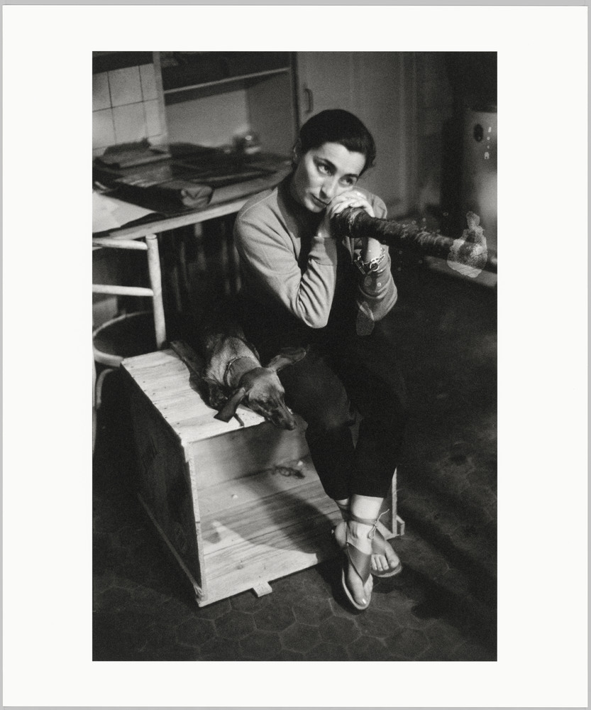 Portrait de Jacqueline Roque contre la presse au sous-sol de La Californie, avec Lump le teckel, Cannes, en 1957