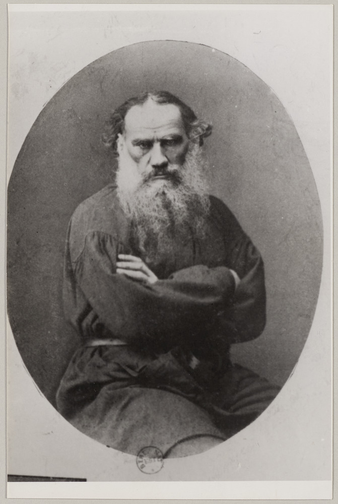 Portrait de Léon Tolstoï assis avec les bras croisés