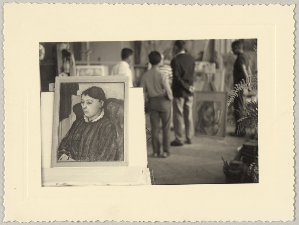 Portrait de "Madame Cézanne en robe rayée" de 1883-85, huile sur toile posée sur un carton à dessin, avec Picasso et un groupe de visiteurs au fond, à La Californie