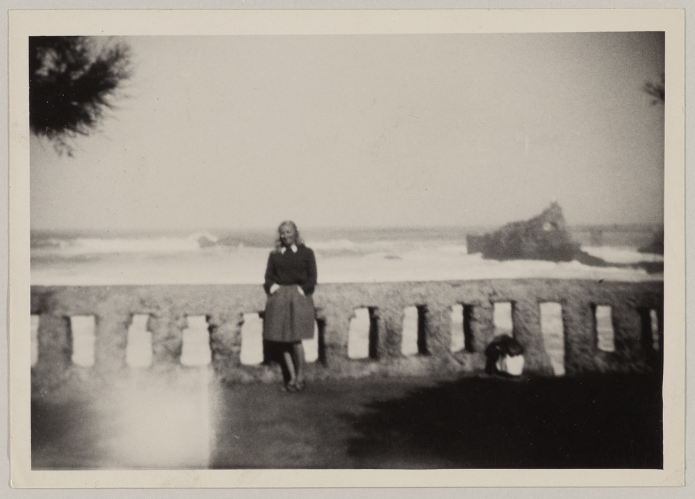 Portrait de Marie-Thérèse Walter devant la balustrade d'une terrasse donnant sur la mer, [Biarritz]