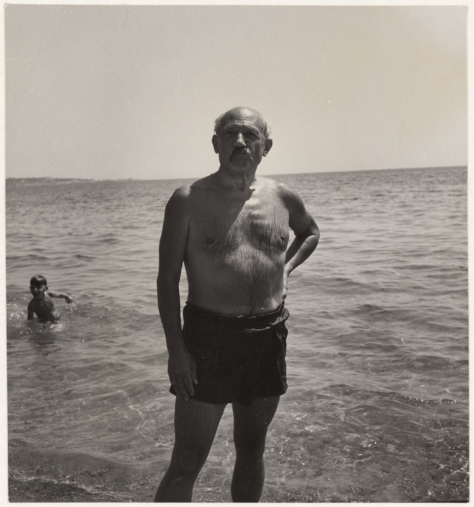 Portrait de Pablo Picasso avec des algues en guise de moustache sur la plage de Golfe-Juan