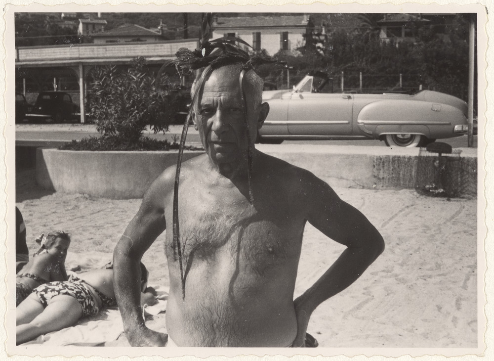 Portrait de Pablo Picasso avec des algues sur la tête sur la plage de Golfe-Juan