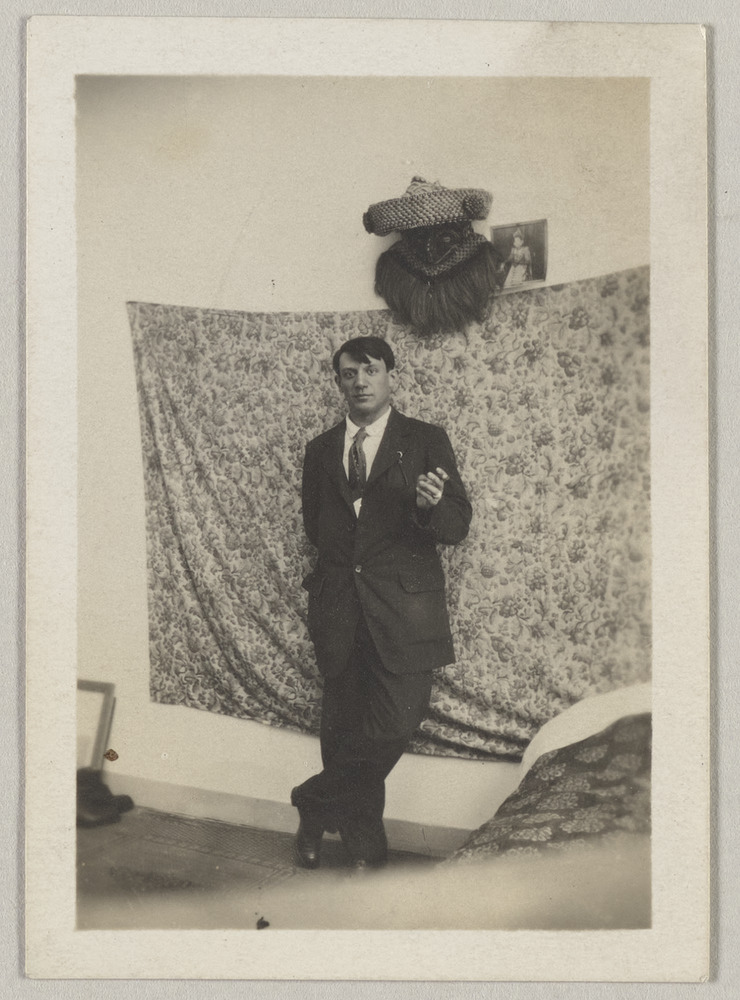 Portrait de Pablo Picasso contre une tenture accrochée au mur de la chambre, atelier de [Pablo Gargallo, rue Blomet à Paris], entre 1912 et été 1914