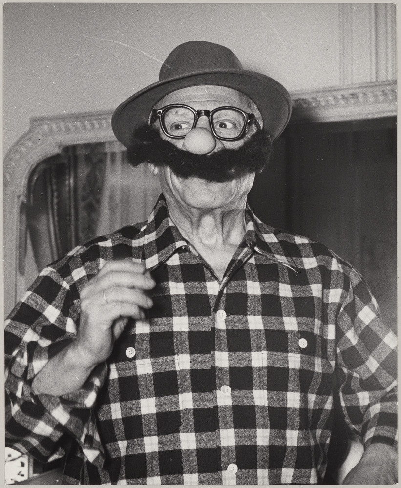 Portrait de Pablo Picasso déguisé avec lunettes, faux nez, barbe postiche et chapeau dans l'atelier de La Californie, Cannes, en 1960-61