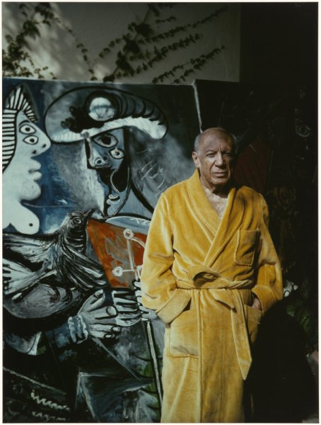 Portrait de Pablo Picasso en robe de chambre jaune devant la toile "Le matador…