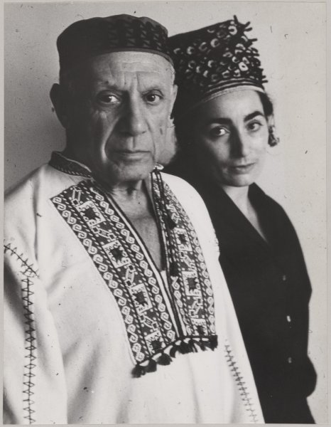 Portrait de Pablo Picasso et Jacqueline Roque en tunique et coiffe orientales, [dans les années 1960]