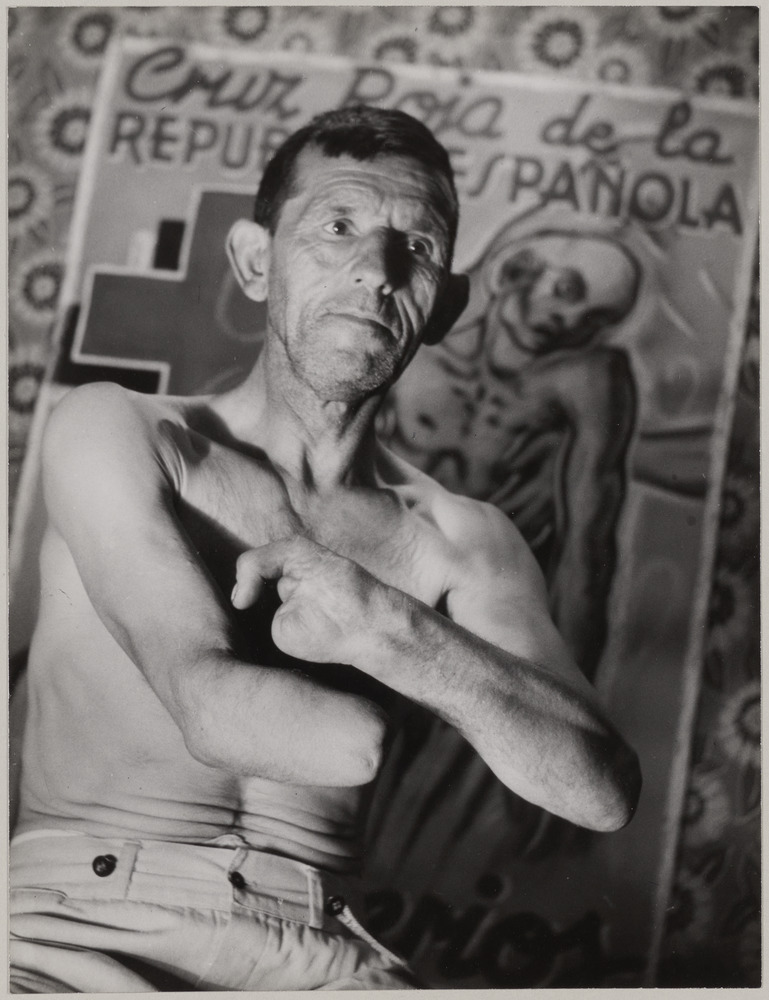 Portrait d'un exilé espagnol amputé des mains à la Croix Rouge espagnole, dans le sud de la France, en 1947-48