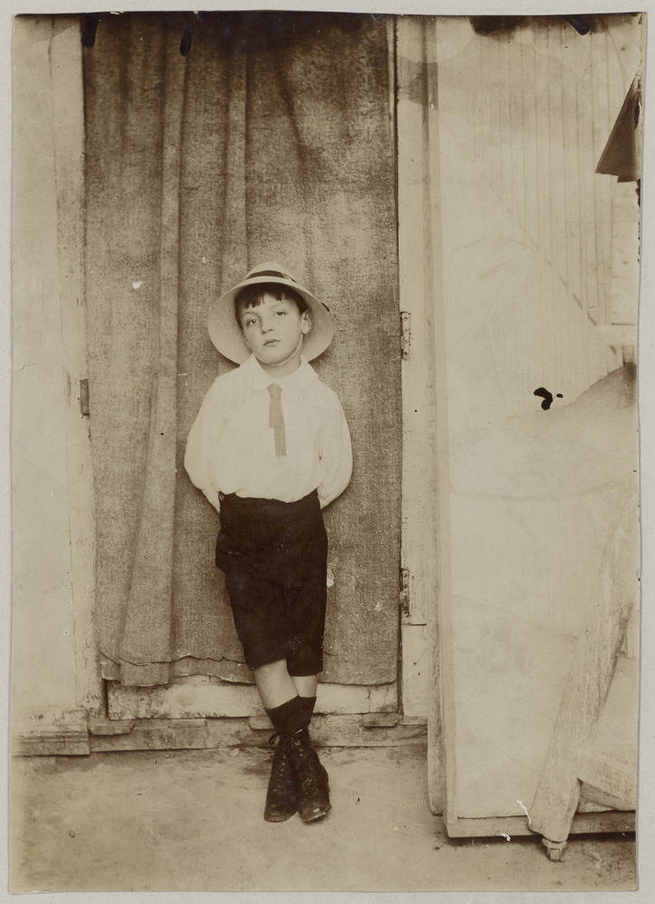 Portrait d'un jeune garçon adossé contre une porte, dans les [années 1910]