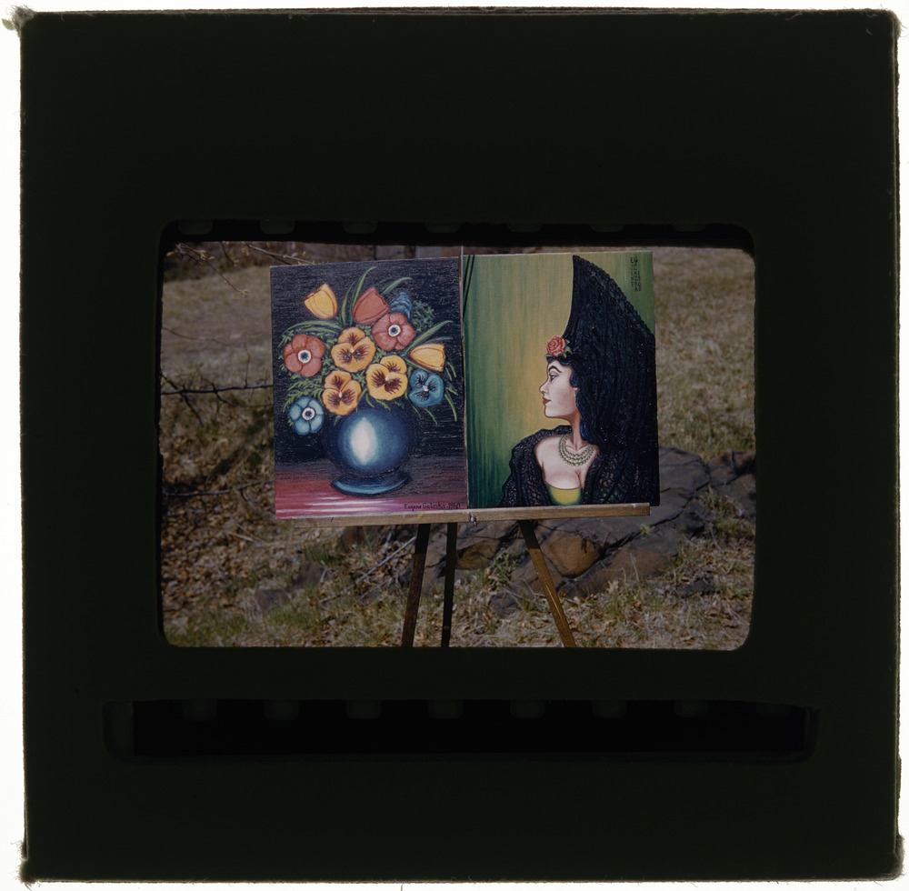 Portrait d'une femme à la mantille et Nature morte de 1960 par Eugène Galazka, posés sur un chevalet en extérieur
