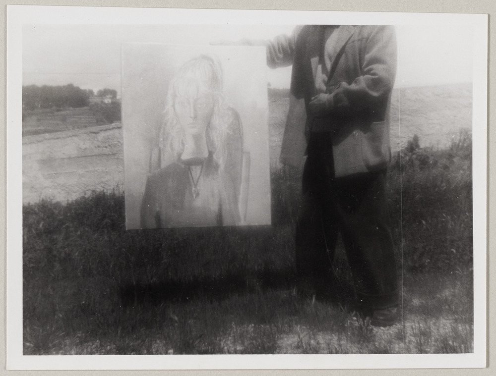 Portrait peint de "Sylvette" de 1954 tenu par Pablo Picasso dans la cour de l'atelier du Fournas, Vallauris, en 1954