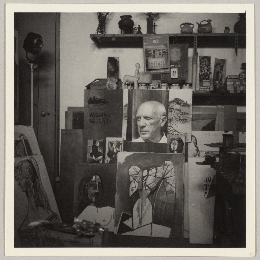 Présents sur la photographie les oeuvres "Buste de femme", "Sylvette à la blouse rayée" et "Sylvette" et le portrait photographique de Picasso par Gilles Ehrmann (1952)