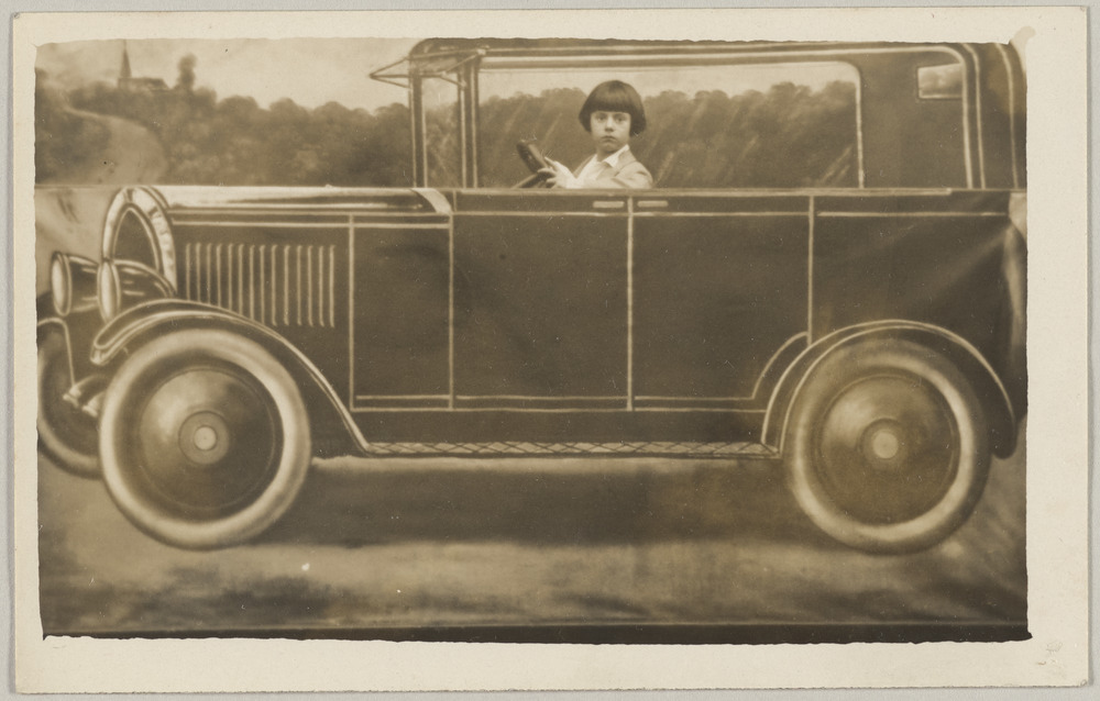 Portrait-souvenir de Paul Picasso conduisant une voiture, au Jardin d'acclimatation du Bois de Boulogne, Paris, en 1925