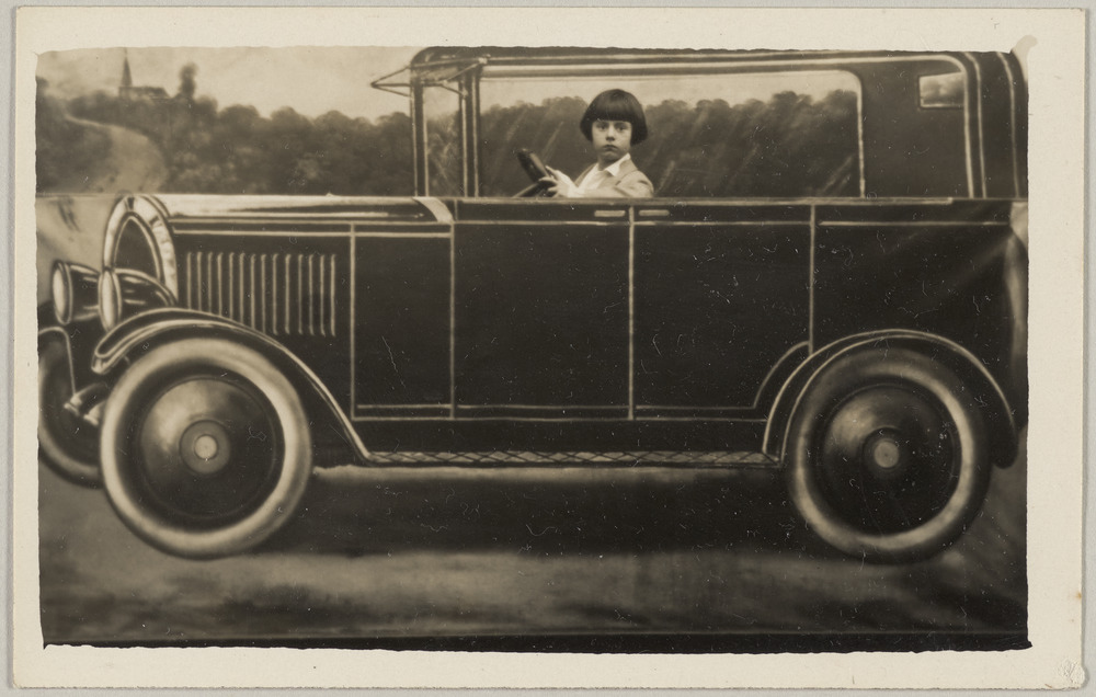 Portrait-souvenir de Paul Picasso conduisant une voiture, au Jardin d'acclimatation du Bois de Boulogne, Paris, en 1925