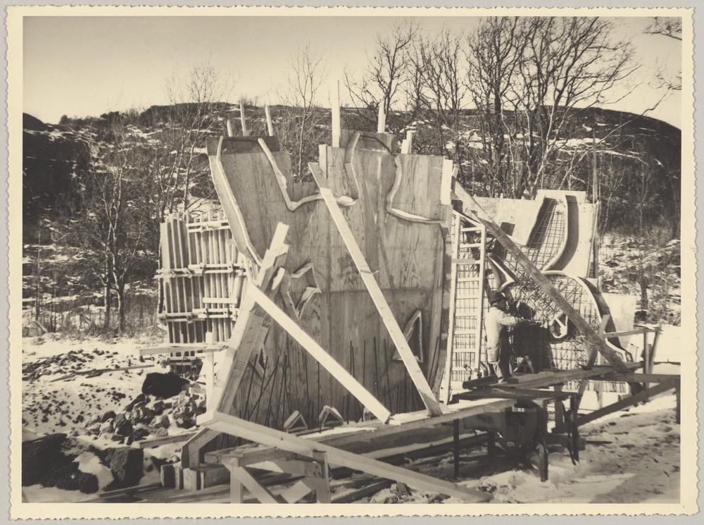 Pose des fers sur l'une des sculptures du groupe "Le déjeuner sur l'herbe", projet pour le Moderna Museet de Stockholm, en 1965-66