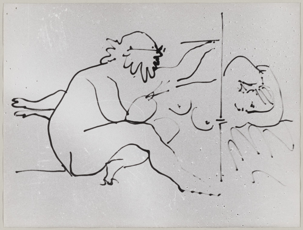 Premier état du dessin "Peintre et son modèle" sur le tournage du film "Le Mystère Picasso" de Henri-Georges Clouzot, Studio de la Victorine, Nice, en 1955