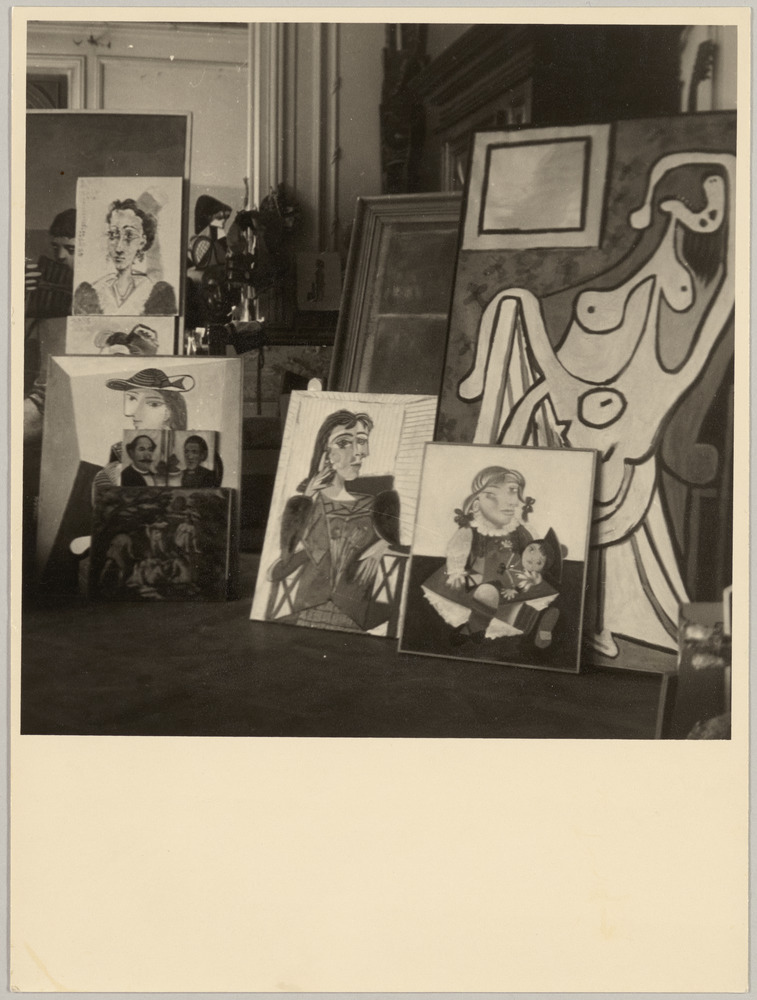 Présentes sur la photographie les oeuvres : "Maya à la poupée" (MP170), "Portrait de Dora Maar" (MP158), "Portrait de Marie-Thérèse" (MP159), "Grand nu au fauteuil rouge (MP113), "Cinq baigneuses" (MP2017-10), "Portrait de l'artiste à la lampe" (MP2017-37), "Portrait de la seconde femme de Rousseau" (MP2017-38), "La flûte de Pan" (MP79) et en arrière-plan, "Femme à la robe verte"