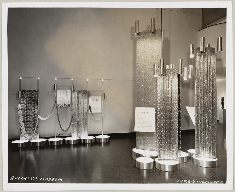 Présentation des panneaux de tissus de Chagall et Dufy lors de l'exposition "Artists in Fabrics" au Brooklyn Museum, en 1955-56