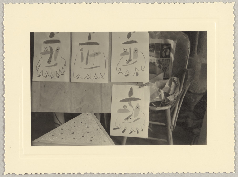 Présentation d'une série de dessins aux crayons de couleur "Tête" fixés sur un panneau en bois dans l'atelier de La Californie, Cannes, en [1961]