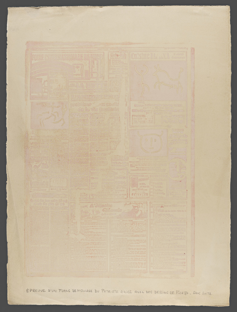 INSC. : Inscription au crayon par Hidalgo Arnéra : "épreuve d'un flanc de moulage du Patriote à Nice avec des dessins de Picasso / sans suite"