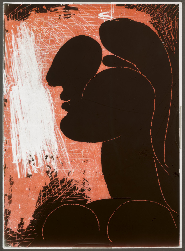 Plaque de verre laissée par Brassaï dans l'atelier lors des prises de vues en 1932 et que Picasso grave.