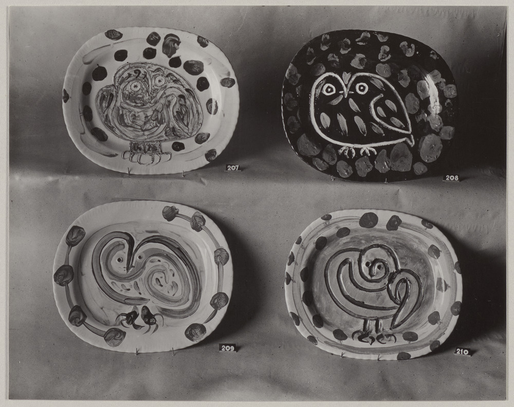 Quatre plats rectangulaires en céramique décorés "Hibou", "Chouette gravée sur fond brun", "Chouette polychrome", "Chouette gravée sur fond beige et bleu", dans l'atelier Madoura, Vallauris, en 1948