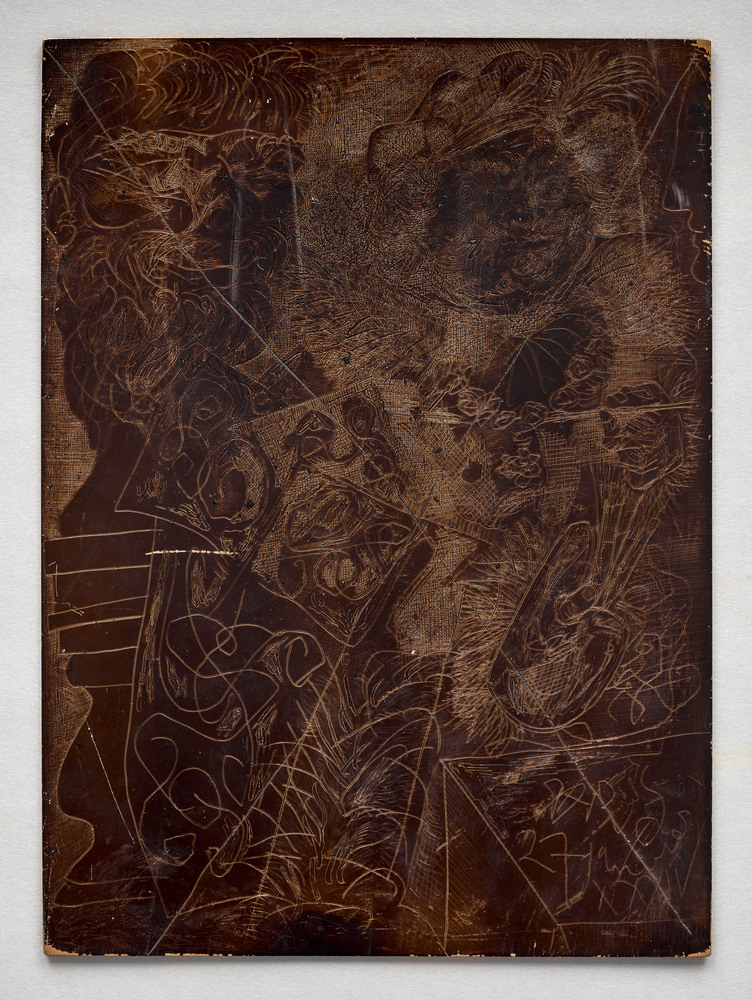 Eau-forte sur cuivre. Plaque rayée et vernie