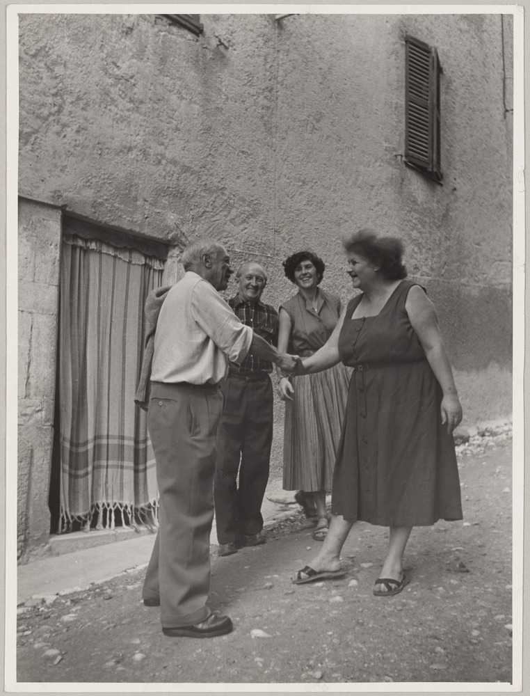 Papier contrecollé au dos du tirage avec annotations tapuscrites : "no. 6583/17a. Madame Delacroix welcomes Picasso outside her house on the remparts of Saint Paul. In the background are her husband Andre and her daughter, Lilian."