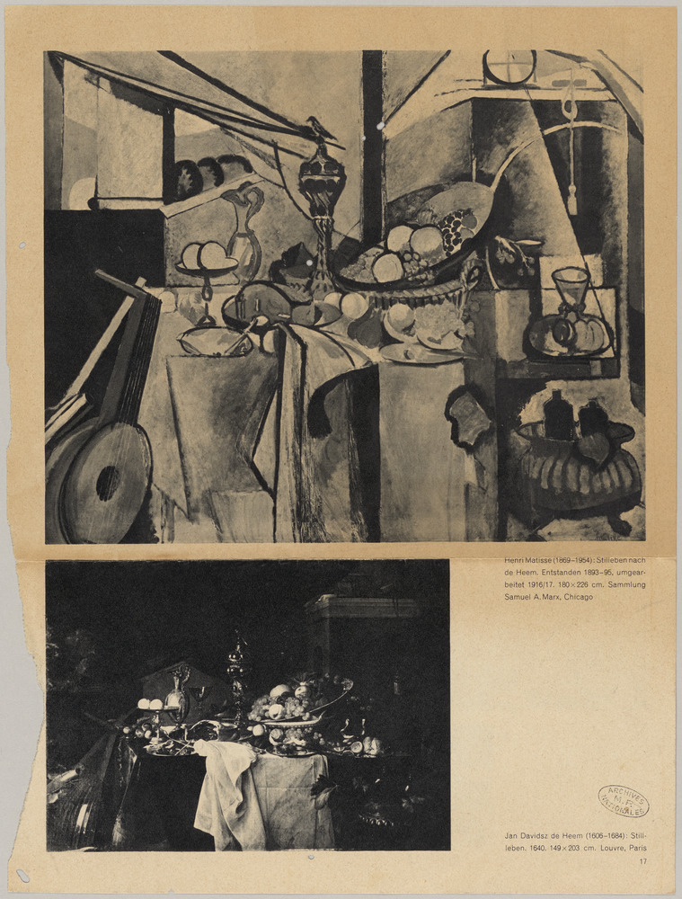 Copié dans le presse-papier :Reproductions imprimées des "Nature morte" d'Henri Matisse et de Jan Davidsz de… - s.d. - https://cep.museepicassoparis.fr/explorer/reproductions-imprimees-des-nature-morte-dhenri-matisse-et-de-jan-davidsz-de-apph13480