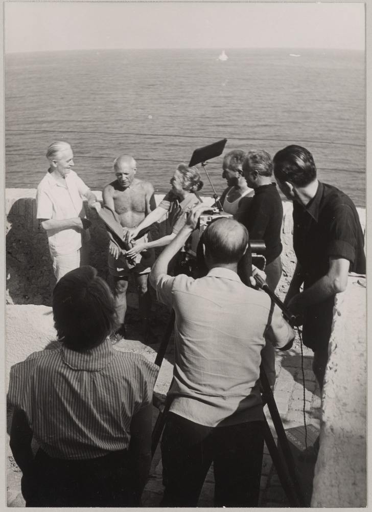 Romuald Dor de la Souchère, Pablo Picasso, [Blanche Dor de la Souchère], Marcel Boudin et Manuel Ángeles Ortiz avec l'équipe de tournage dans le jardin de sculptures du château Grimaldi, lors de la séquence 2 du tournage de "La vie commence demain" de Nicole Védrès, Antibes, en 1949
