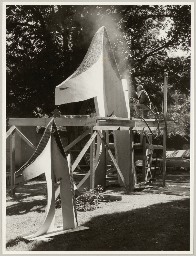 Sablage de la sculpture "Femme aux bras écartés" et maquette intermédiaire au 1er plan, prieuré St-Hilaire, Chalo-Saint-Mars, en août 1962