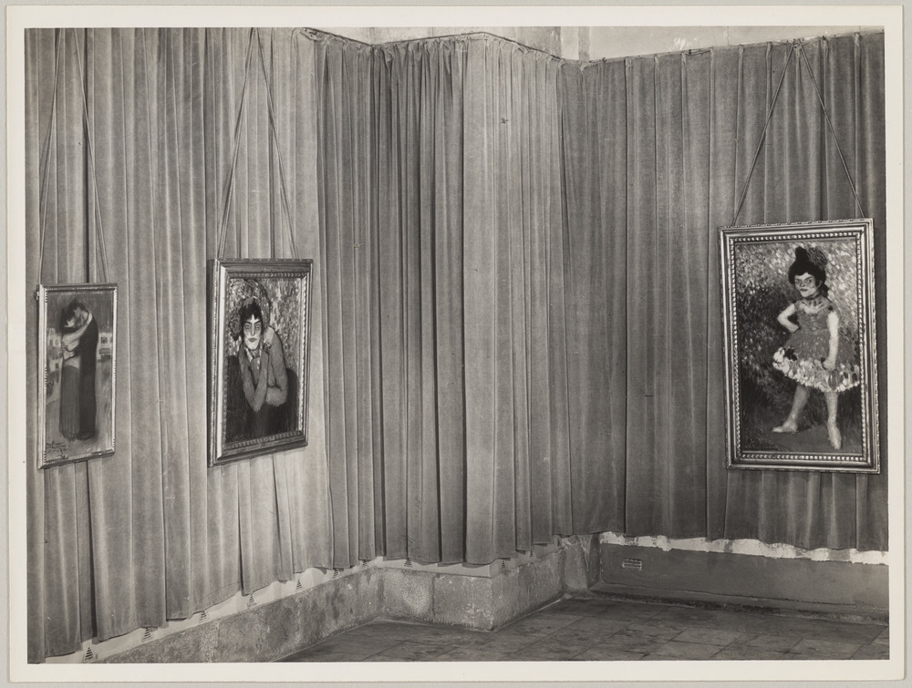Présentes sur la photographie les oeuvees : "Pierreuse la main sur l'épaule" de 1901, "Danseuse naine" de 1901 et "Amants dans la rue" de 1900