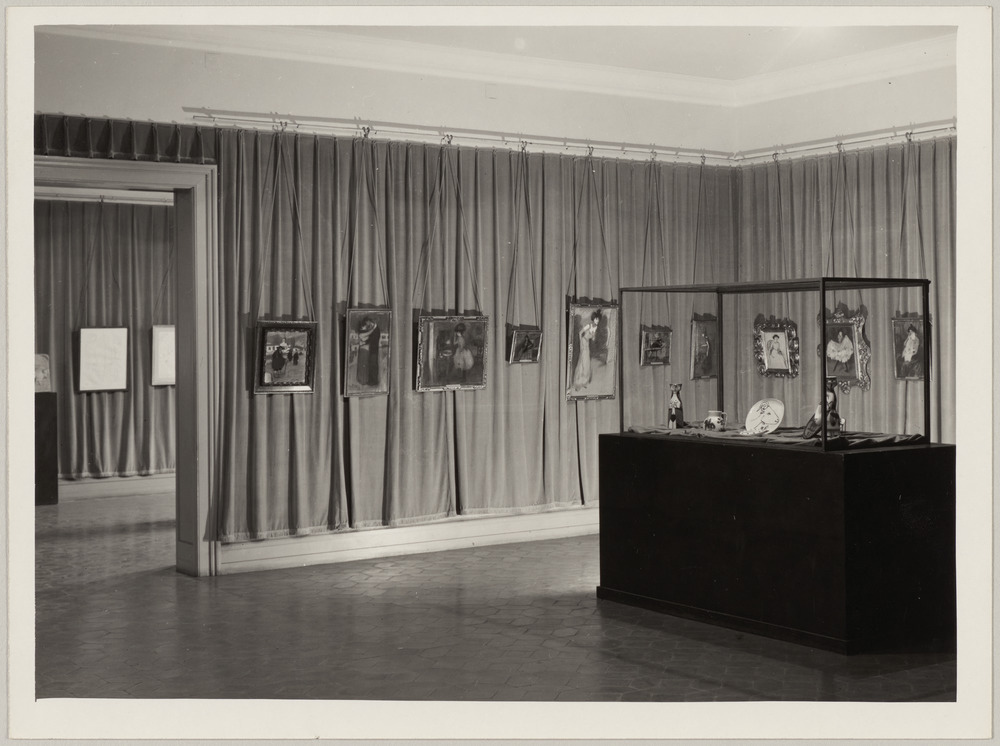 Présentes sur la photographies les oeuvres : "Lola Picasso, soeur de l'artiste" de 1899, "La fin du numéro" de 1900, "La diseuse" de 1901, "Femme au chale" de 1899, "Le divan" de 1899, deux oeuvres sans titre de 1901 et 1902 et une vitrine présentant des céramiques des années 1940-50