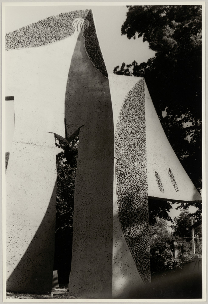 Sculpture en bétogravure vue de dos "Femme aux bras écartés", prieuré St-Hilaire, Chalo-Saint-Mars, en [1962]