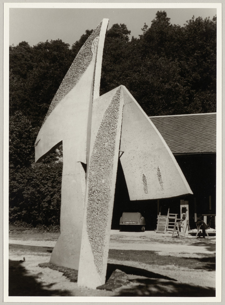 Sculpture en bétogravure vue de trois-quarts dos "Femme aux bras écartés", prieuré St-Hilaire, Chalo-Saint-Mars, en 1962